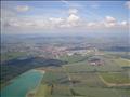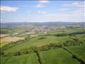 Pohled od Hulína na město Kroměříž, rovinatá krajinka i s obláčky.